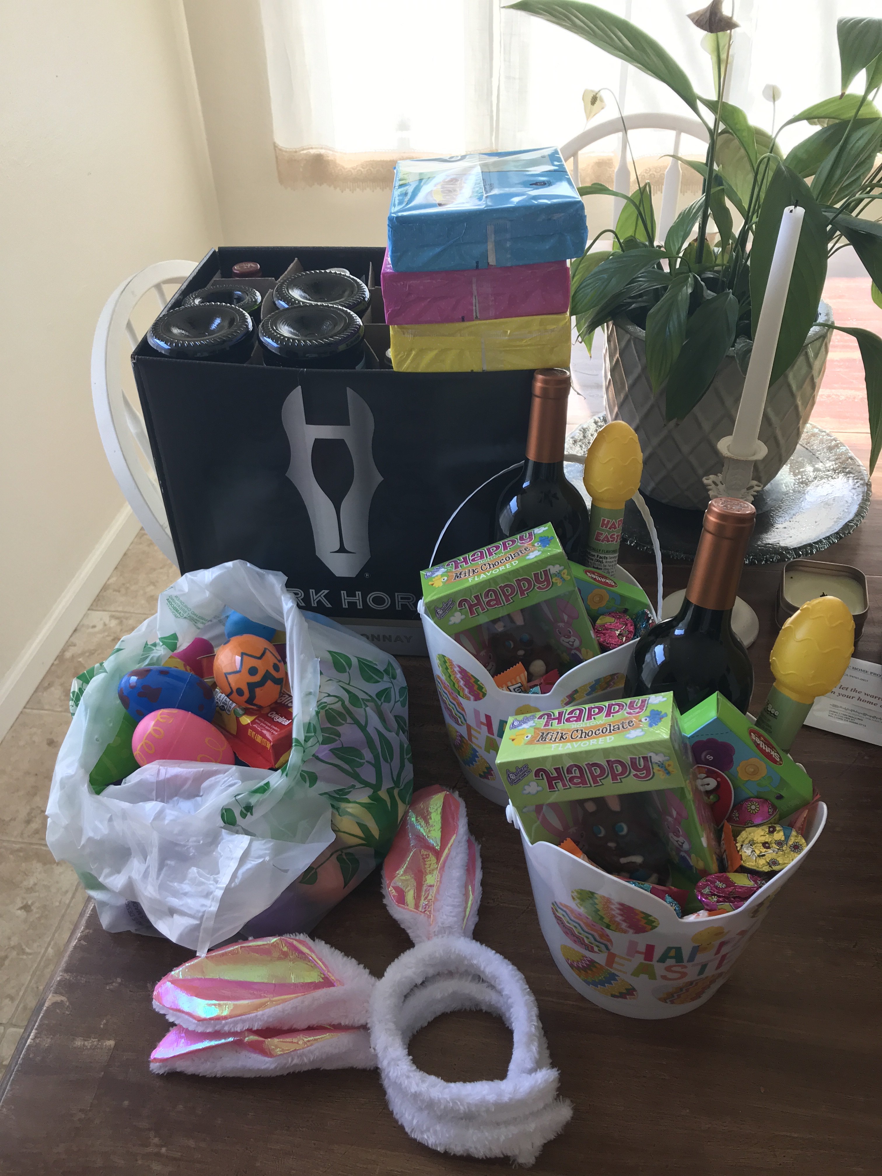 Needless to say, I got tired of the bullsh!t and if I wanted fun holidays, dammit I was going to make them fun. So, last year was the inaugural Adult Easter Egg Hunt. I’m sorry, but if you’ve never seen 10+ adults running across fields looking for eggs and bottles of wine, you just haven’t lived. We don’t have little kids on my mom/step dad’s side of the family, but why should that stop us from having an Easter Egg Hunt? Throw a little booze in there and you’ll draw every adult in 2 square miles. Here’s how it went: I made everyone draw cards so they were on random teams of 2. Each team started with one clue that took them to another place on the property, they got their next clue, and so on. The point was to collect all their clues and end up back in the house, all the while looking for candy eggs, money eggs, bottles of wine, and cases of beer. We had the best time! It was complete chaos, and our family is competitive, so it was like the best of all worlds. This year, to keep it fresh and exciting, I changed it up a bit. Everyone was on random teams of 2, but it was more of a traditional hunt. Well, with a twist. In order to beginning “hunting” each team had to qualify with 2 activities. They had to shoot and pop a balloon with a BB gun, and then successfully toss an egg at a specified distance, without breaking or dropping it. Once they did both of those things they could begin hunting. There were: candy eggs, bottles of wine, cases of beer, tallboys, Peeps, trivia cards, and ribbon. Ribbon you say? Yes ribbon. Tied to various animals across the property. For added entertainment on my end I put the ribbon on the animals who were the biggest a$$holes. For instance, the two fighting geese, the attack rooster, and the meanest mare in the west. This was in fact funny, but almost as funny was Grandpa and I trying to catch the little ba$!ards to tie the ribbon on them. Each item in the hunt had a different point value attached to it. Whatever team came back with the most points, won a gift basket with wine and candy. The loser, well they had to wear bunny ears the rest of the day.