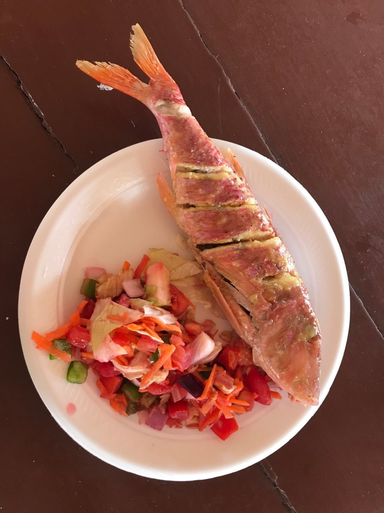 With the Island (and beach, and bar) almost in reach we drop anchor and every bails out to seeeee the fish. No thanks. I’ll wait in the boat. Except I easily succumb to peer pressure and before I know it my ass is in the water scootin’ around. It was short-lived but I did see some cool fish and drink some salt water. Yum. Finally we’re headed to the Island where we get to hang out and have lunch. The beach was beautiful and calm. White sand, blue water, relaxing. And lunch was delish. We dropped a straw in a coconut and had fresh coconut water and tried Caribbean Salmon.