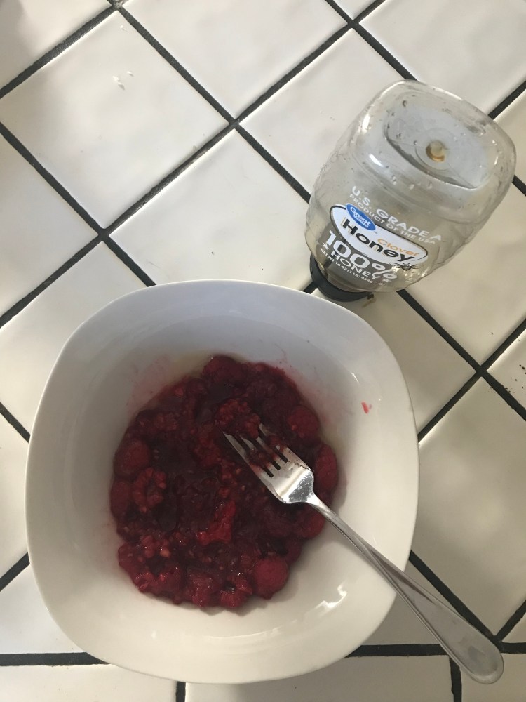 - While the water is heating, put the remaining (unfrozen berries) in a bowl and add sugar or honey. I opted for honey here and just approximated it (tried to use less than the 1/2 cup). When I’m able to, I try to avoid using sugar. I prefer natural sweeteners like honey, and I’ve justified this in my head as being healthier.