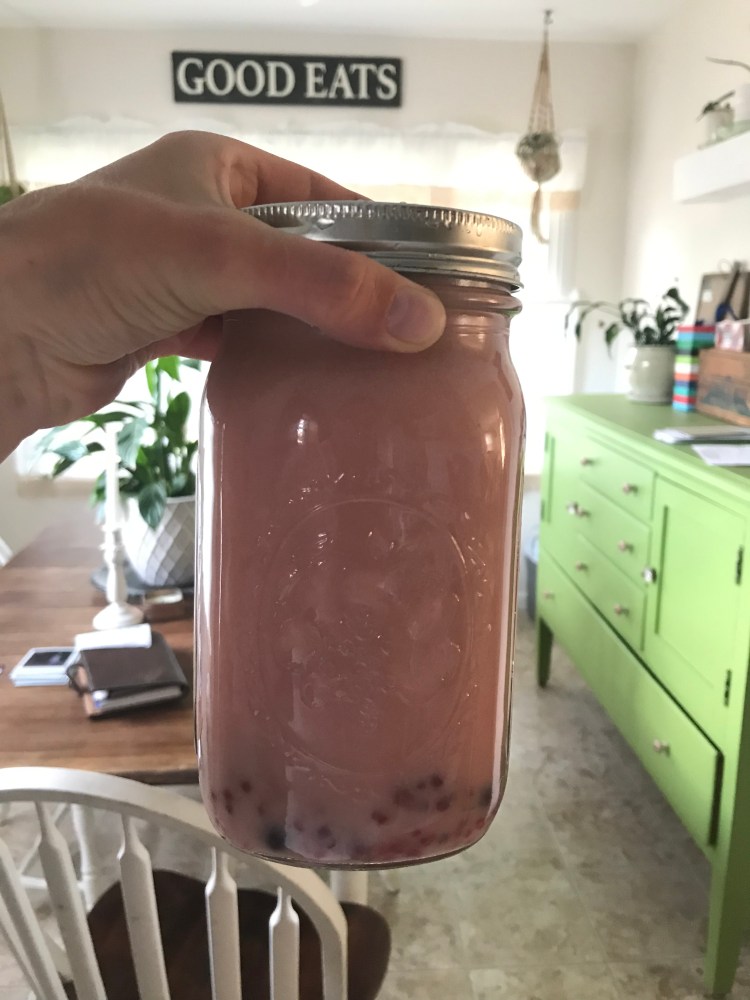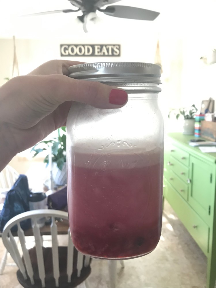 As always I improvised. Most of the time when I improvise it’s because Jared did the shopping, and well, ya get what ya get. That was the case here. I didn’t have blackberries on hand, so I subbed those out for raspberries. I think this recipe would be good with any berry! I didn’t have the full amount of berries recommended, so I used what I had and it turned out fine with plenty of “infusion”. I also dumped all the cream into the pitcher and put the frozen berries (a combo of raspberry, blackberry, and blueberry) into the mix, not necessarily waiting until it was being served. Once I had my fill, I put the leftovers in a mason jar in the fridge. Since I made it, I have pulled it out when I want a refreshing sip. The cream, tea, and fruit chunks do separate when they sit for an extended period of time. Just shake it up and you’re good to go.