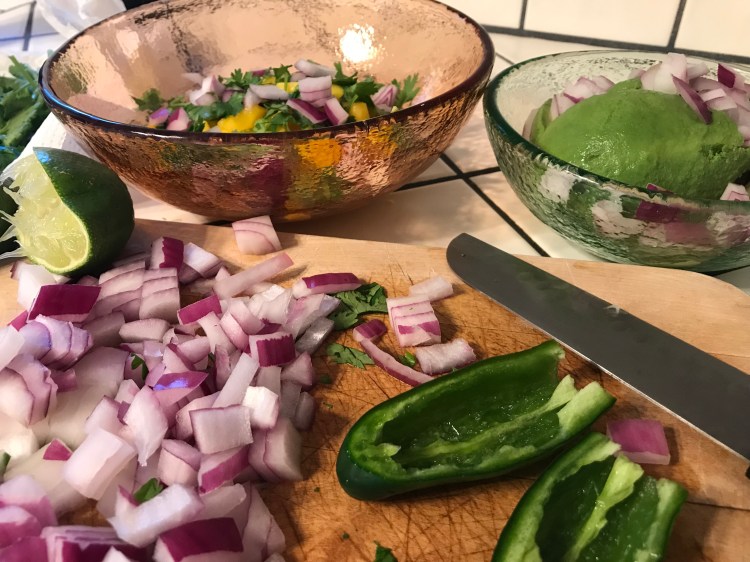 As always, when making the mango salsa I used the recipe as a guide… but strayed. I opted to use the frozen diced mangoes I had at home for my smoothies, in place of the fresh mangoes. What can I say, I’m cheap, lazy, I don’t think the local grocery store carries mangoes (#smalltownprobs), and I don’t know a ripe one from an unripe one. Frozen mangoes seemed like the way to go. I pulled the bag out of the freezer at lunch and put it in the fridge to thaw until that night. When it was show time, I cut down the thawed chunks so they were more bite-sized. Since Jared didn’t want any, I eyeballed the amount I thought I’d want. From there I diced the cilantro, jalapeño, and onion. I added the amount of each that looked “right” and tasted along the way (a small handful of each). I added more of each until it suited my liking (you can always add, more but it’s hard to take some out). I then squeezed about half a lime onto the top, added some salt, and was ready to go.