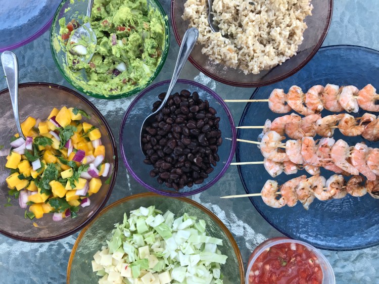 For the rest of the dinner spread – pretty easy. Put your can of black beans on to heat up, start your rice (however many servings you want), chop your cabbage, pull some tomato salsa out of the fridge (or dice some tomatoes), and BBQ your shrimp. I like fresh, raw shrimp from the meat counter at the store, so that’s what I get (not the frozen bagged stuff). It’s not much work and so much tastier! Rinse and peel them, then skewer the little buggers. I like the grill marks and flavor, so we opted to skewer and direct-grill vs. putting them on tinfoil. It only takes about 5-10 minutes to barbecue the shrimp, so make sure everything else is started before you put them on!