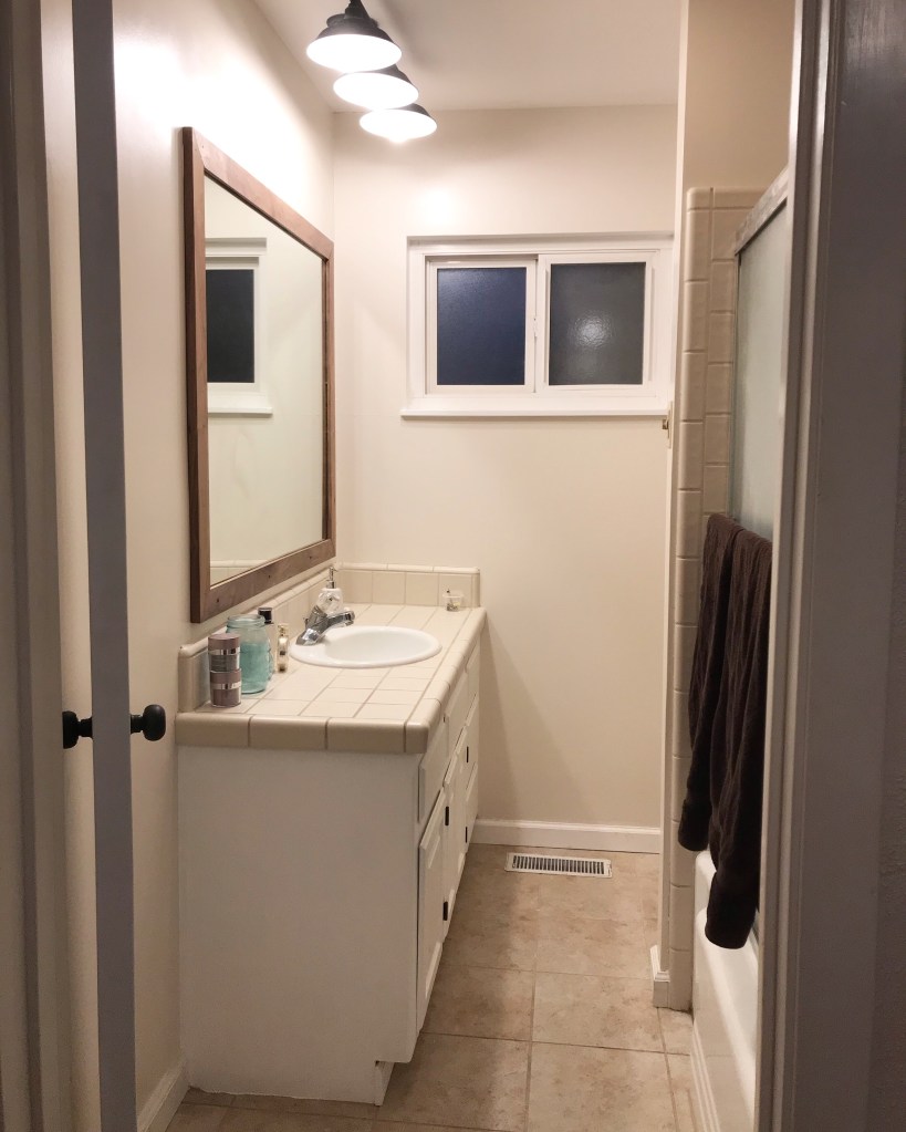 The remodel not only included the hijacking of our toilet and laying tile, but also: ripping out the old floor, painting, retrofitting the new light fixture and rewiring the bathroom, framing out the old mirror, adding trim, sanding and painting the vanity and cabinet, cleaning… and wah-la. A beautiful bathroom. Complete with neutrals and radiating brightness. I love it.