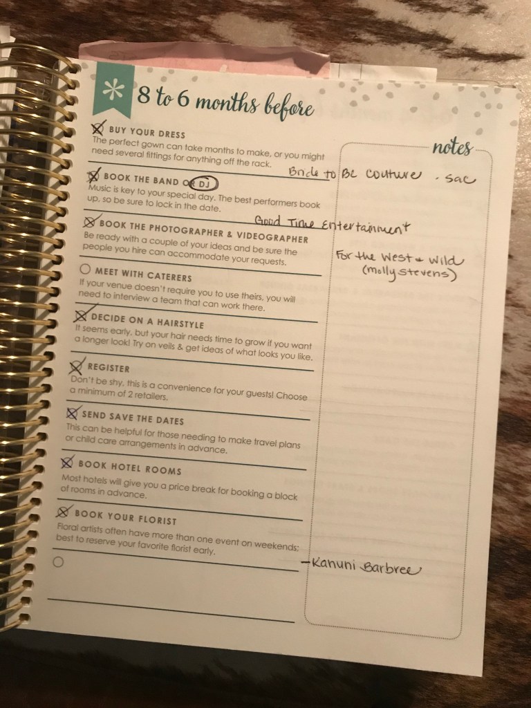 - Get organized. Recently, I have heard a few new brides say, oh I don’t need a website. WRONG! You should create one, if not for your guests, then for yourself and the tools that come along with it. It’s an easy access point for them to hop on their phone and look up where you’re registered, or a reminder for the time and address of your venue. Websites are what you make them, you can go all out and post engagement photos, details about your wedding, places to stay, registries, etc., or you can do the minimal and just have your names, venue, date, time, and registry links. As a tool for you, websites offer the check-off lists. This was great for me! When you log on to your account through The Knot or Wedding Wire (or whichever server you choose), there is a timeline based on your wedding date that helps you stay organized. Have you booked you venue? Check. Have you ordered your save the dates? Check. Have you ordered your wedding dress? Check. Etc, etc., I also highly recommend getting an Erin Condren wedding calendar/organizer. They are like $40-$50 online but again, it’s a year calendar based on your wedding date that includes so many helpful tools. My favorite were the pages that had timelines and check lists on what you should have accomplished 12 months from wedding, 6-8 months from wedding, week of wedding, and everything in between.