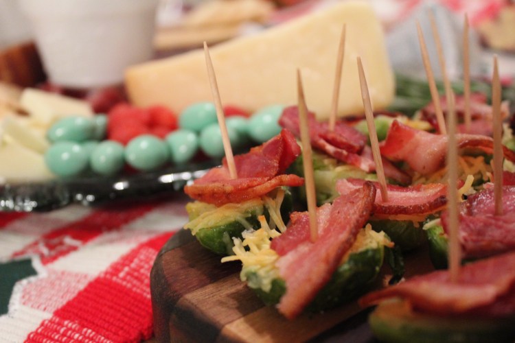 First I sliced my brussel sprouts in half and steamed them to speed up the cooking process. Then I put them on a baking sheet, gave them a heavy sprinkle of garlic salt, and topped with some Rumiano Shredded Romano, then popped them in the oven at 375 degrees. I left them in there for a few minutes, turning the oven on broil to finish melting/browning the cheese. While they were baking I fried up some bacon in 3 inch pieces. Once they were nice and toasty and the bacon was done, I pulled them out of the oven. I used a toothpick to secure each a healthy slice of bacon on the top of each sprout. They were so, so tasty! If you wanted to add an additional layer of sweetness, you can drizzle with honey and/or balsamic glaze. These were perfect for the board. They represented the veggie category, were warm, and met the color palette I was working towards. Plus, they were everything savory. These were good enough to be a standalone appetizer, too.