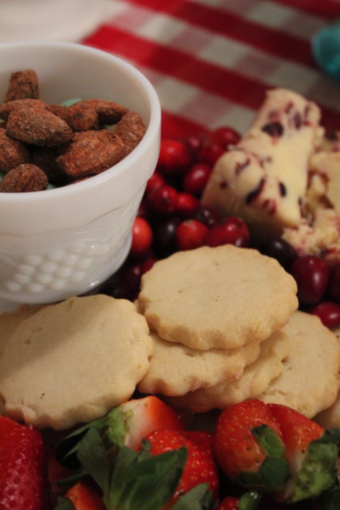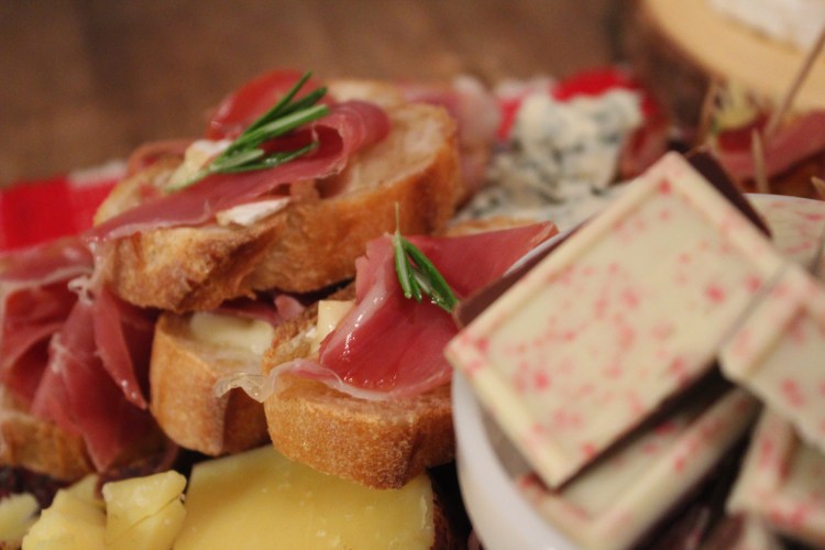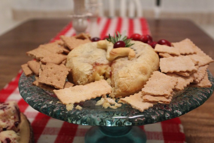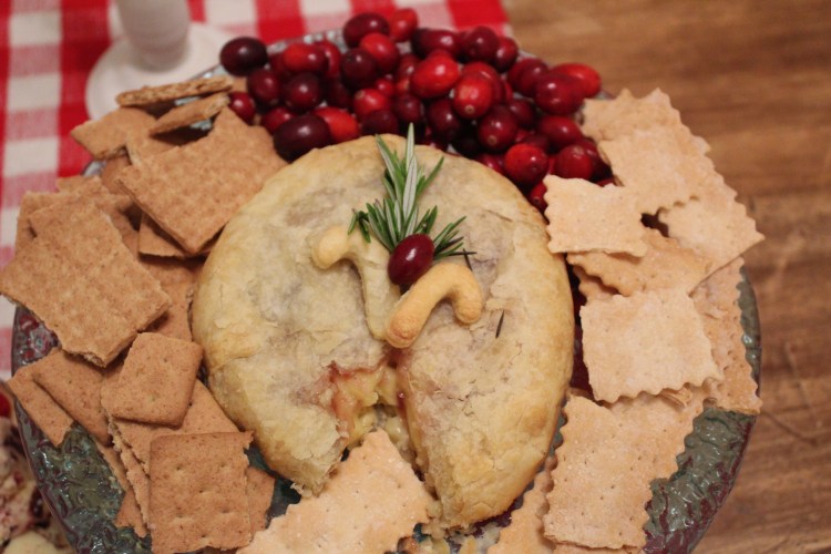 No cheeseboard (especially a Christmas board) is complete without baked brie (to be fair I grabbed a camembert not a brie, but they’re very, very similar). There are a million renditions to baked brie and stuffed brie… I have done tens of experiments with both and am rarely disappointed. (Remind me to start sharing my stuffed brie recipes… you basically will want to make one every week.) Anyway, brie is just one of my all-time favorite cheeses. The earthy taste, creamy texture, how easy it is to pair with, like, everything… I just love it. To make your baked brie, get a sheet of Puff Pastry and let it thaw out. Roll it out to approximately a quarter of an inch in thickness. Place your brie (with the top rind cut off the top) on the puff pastry. Use a butter knife it cut a circle around it, with enough additional pastry for it to cover the sides of the brie. Work your way around the brie, folding the pastry up. If it isn’t “sticking” together, add a dab of water and it will stick to itself. Next up you can add jam, fruit, or other sauce to the open top of the brie. Sticking to my theme, I added cranberry sauce (I didn’t have time so yes, I used canned). I though it would be a nice tart compliment. I would also love to do a cranberry chutney on one, maybe next time! Once you have your sauce on the top, you essentially treat it like a pie top – you can cut strips of the remaining puff pastry for a crisscross patter, or cut another, larger circle to cover the whole top, or use cookie cutters to lay designed pieces over the top. This time I opted to cover the whole brie, and use a candy cane cookie cutter for a couple pieces on top. Cook per the puff pastry instructions, approximately 10-15 minutes at 375 degrees. Once it was done, I added some color with rosemary and cranberry (this also tied the colors and textures in with other elements on the board).