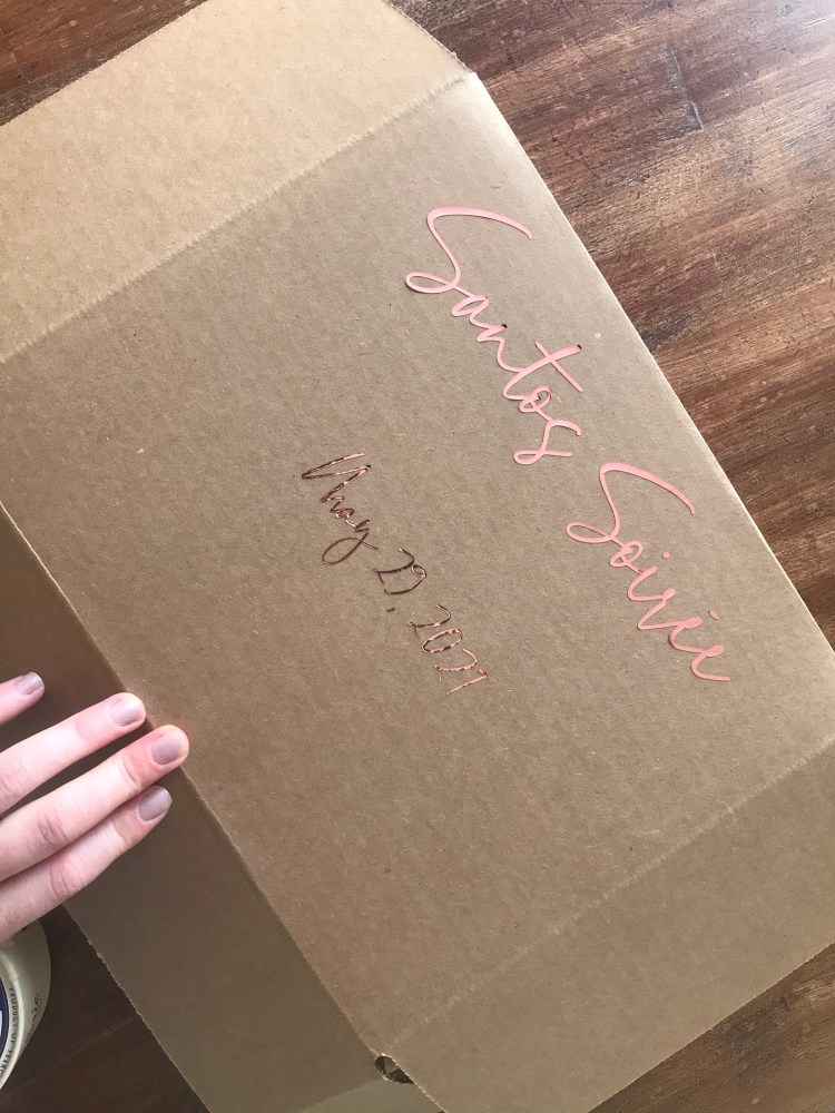 Fortunately for me, I work for a company that made this pretty easy. Not only was I able to get most of the cheese from the plant, but we had packaging materials that were perfect for the proposal boxes, and we are well adept at shipping cheese (all pretty critical for this proposal). I love puns (especially cheese ones) so I included a fun proposal poem, a personalized card to each of them, and a couple of my favorite cheeses. I ordered some custom stickers from Etsy that said our wedding date and “Santos Soiree”. I loved these stickers but they were a labor of love to get peeled apart and attached! I was so happy with how these turned out.