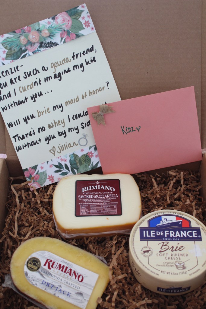 I have seen a lot of bridesmaid proposals and have been to enough bachelorette parties to know I didn’t want to do anything with my gals’ names on it (glasses, robes, etc.). The amount of “things” I have with my name on it are ridiculous. While I love each and every one of the gifts I’ve received, I didn’t want to add to anyone else’s collection. Instead, proposing with cheese felt much more “me”, practical, and fun (who doesn’t love a surprise cheese box?!).