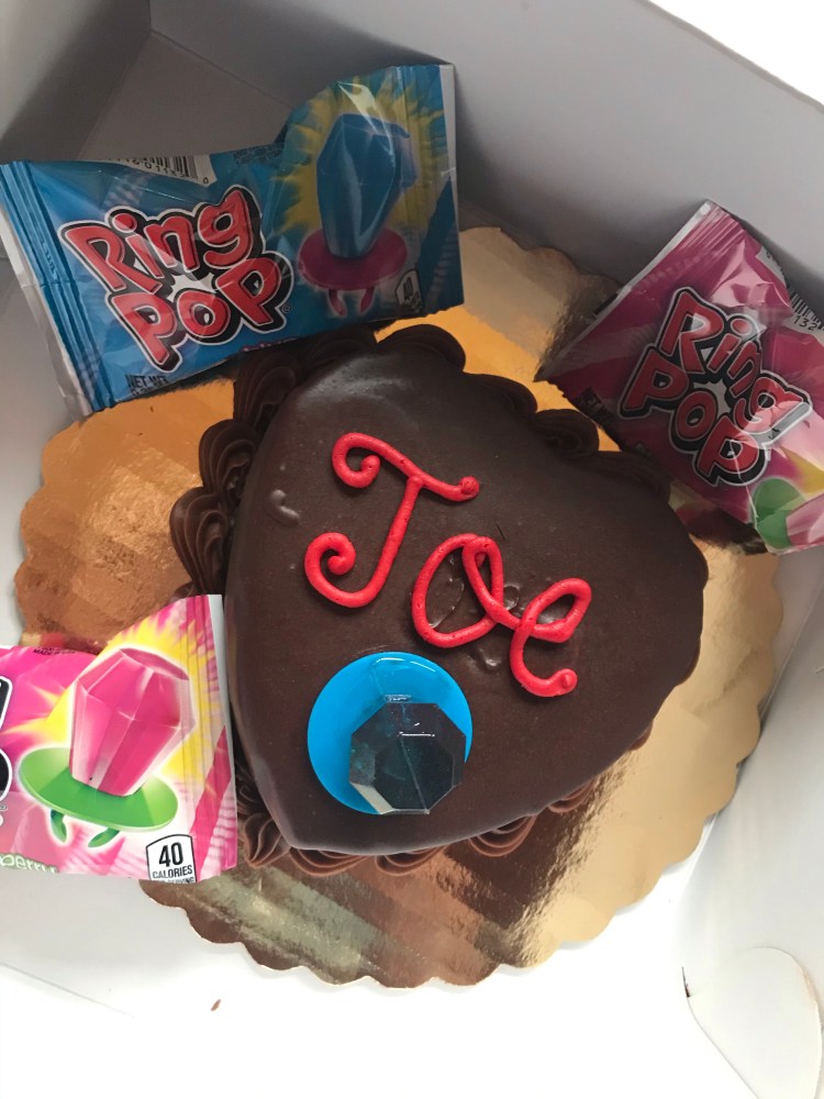 Again with the food… but this proposal was for our boys, so I thought what better gift than something they can eat? I haven’t met very many sentimental boys, so cake and ring pops felt like a safe bet. These were really fun to put together (partially because it didn’t require a lot of work on my end). I called up Old Town Coffee and Chocolates in Eureka to have a couple cakes made with the boys’ names written on them. I also went by the Dollar Tree and picked up a couple bags of ring pops (an appropriate ode to their wedding day task!), and stuffed a ring in each cake, then included the others in the box. I delivered these with a smile, a “good luck” to their parents (yay sugar!), and let them enjoy.