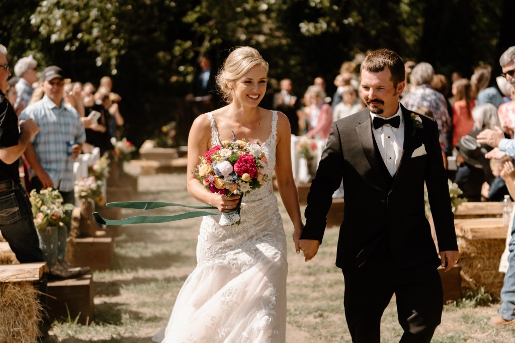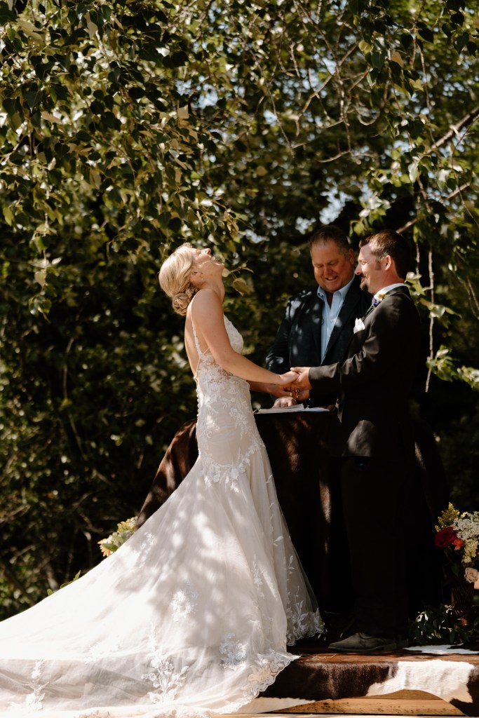 For aisle decorations we did alternating rows with stained wood boxes (compliments of my mother-in-law) with pairs of boots with flower arrangements in them. This rounded out the western, meets bright-and-colorful vision I had in mind! Of course there were some cowhides also sprinkled in, and dad marked the end of the aisle with a beautiful arch made with logs/boards he had milled. Actually, I had planned for dad to build an arch over where we stood, but once we started setting up, we all fell in love with the natural beauty of the tree. It felt so authentic and whimsical to have the tree as our alter.