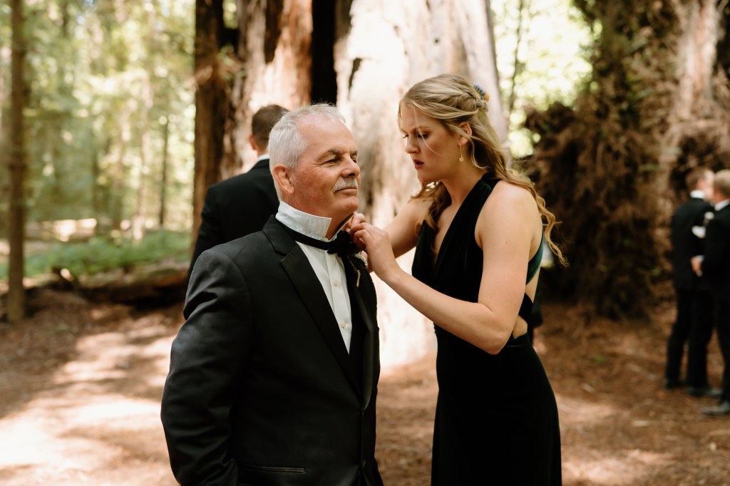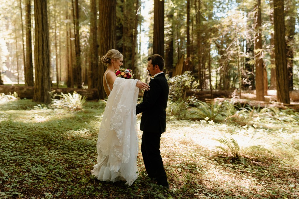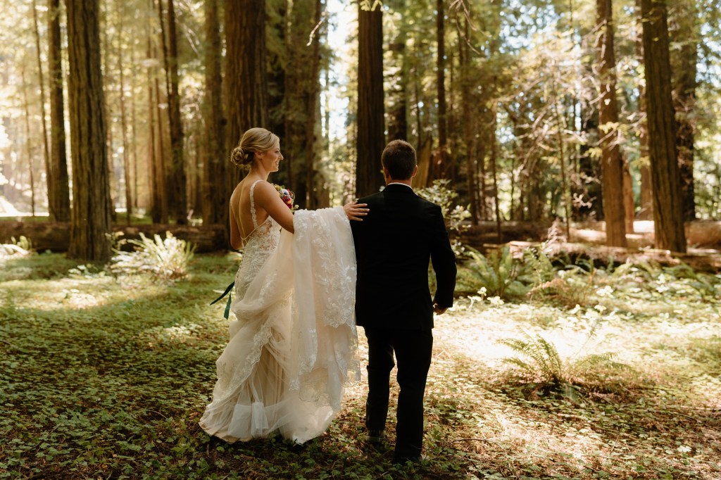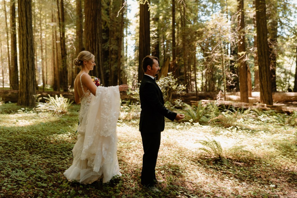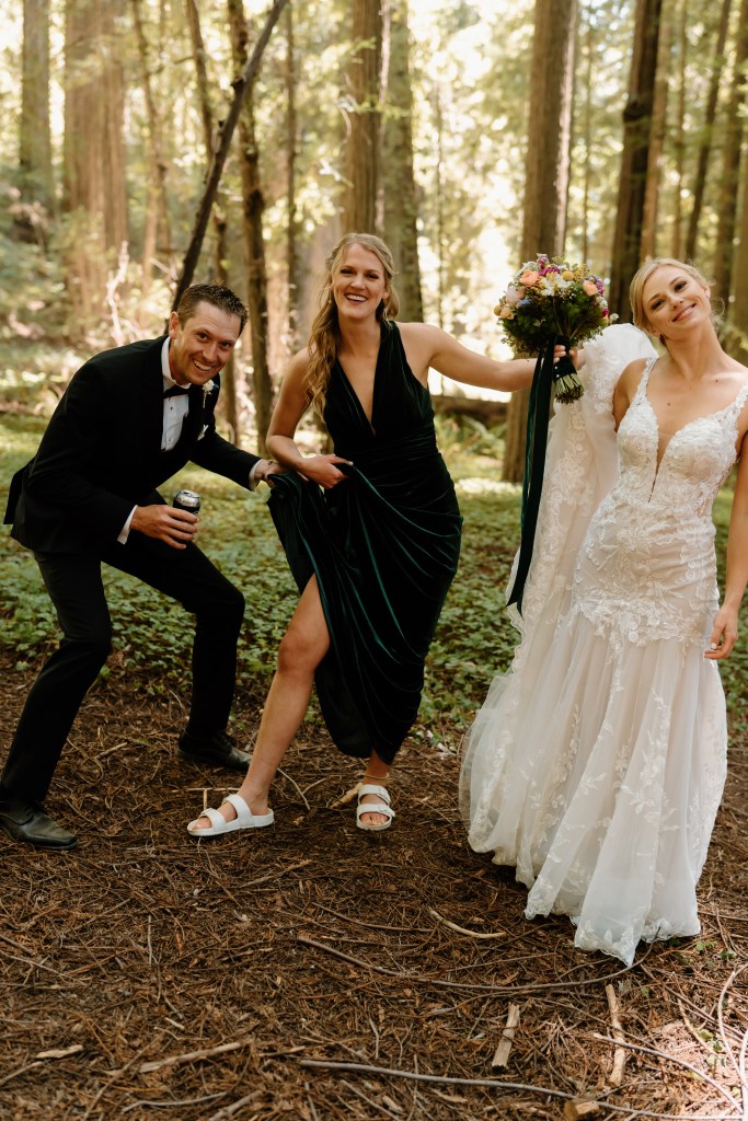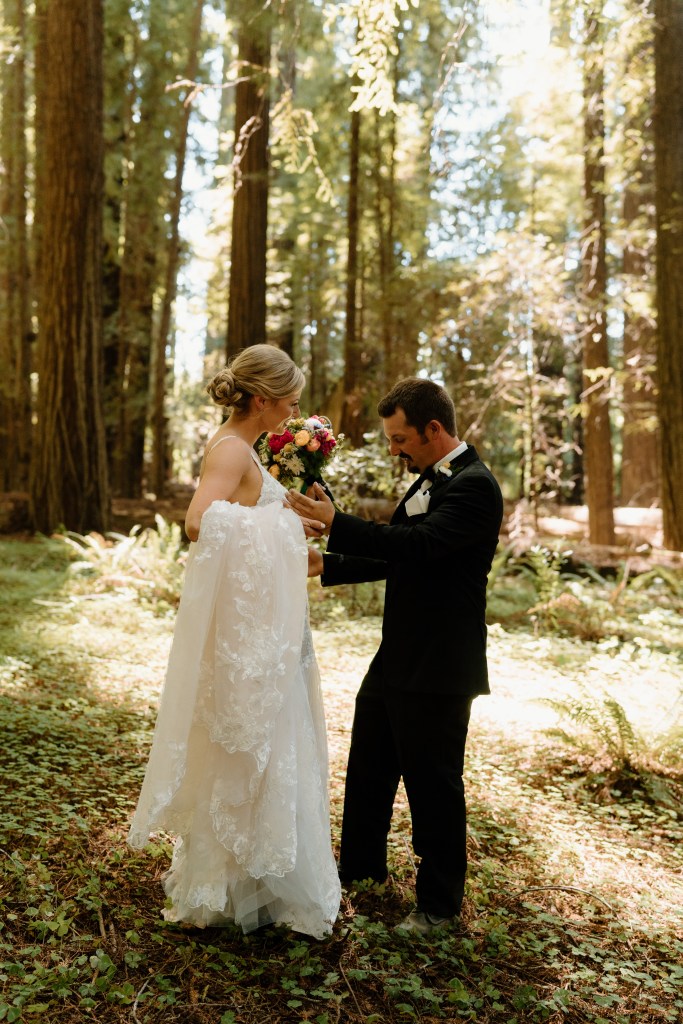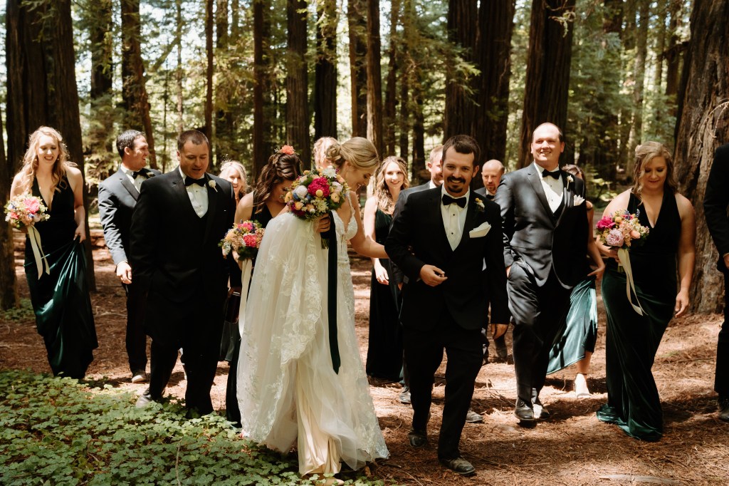 I was torn on whether to see Jared before the ceremony and get our bridal party pictures checked off the list, or have that traditional “first look” while walking down the aisle. I couldn’t decide, so I left it in Jared’s court. He opted to do a first look and take pictures beforehand. I am so glad we went this route!! Everyone is different as to what makes them the happiest, but this worked best for us. We were able to capture the photos in the redwoods I had dreamed of (these kept the theme of our engagement photos, too), getting some pre-wedding nerves out of the way, and allowed us to spend more time with our bridal party! We had such a great and fun group of people, that this was really special. We took photos, drank some beer and had a few whiskeys, and laughed. I loved this short, but fun period of time. I especially loved that this meant we had a shorter lag period between the ceremony and reception.