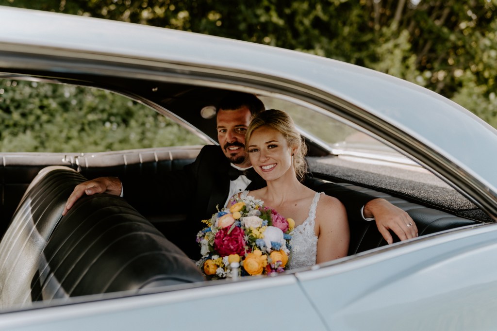 Our ceremony was short and sweet, but so meaningful. It began with my Grandpa Garth driving me to the aisle in his and Gram’s old Chevy. In fact, they have an amazing photo from their wedding night with the old car that Jared and I recreated! I loved having these few minutes with my Pop before the ceremony. Having him there, and the old car, felt like I had a little piece of Gram with me.