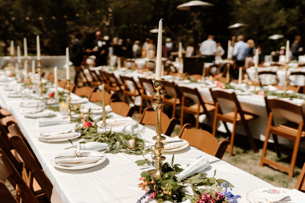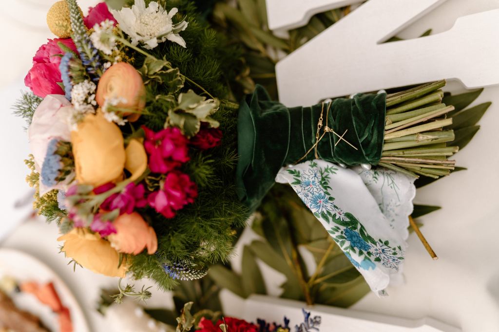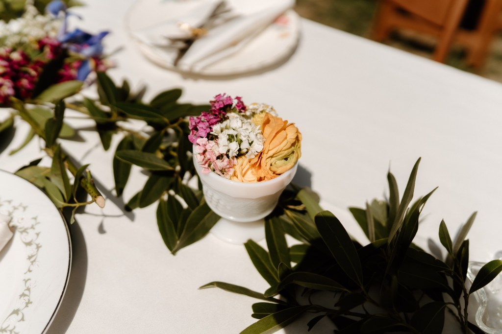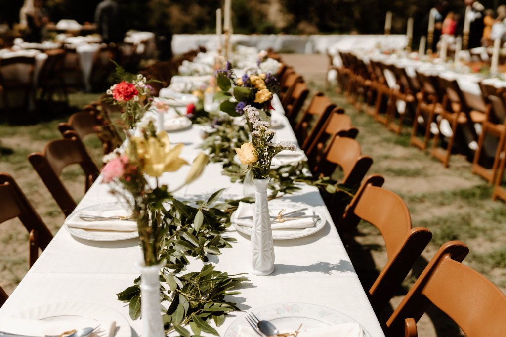 I had a vision for our table settings and reception for months – I wanted that whimsical, elegant, western, classic look (can I throw some more words in there?! Ha!). A lot of preparation went into this part, and I am *mostly* happy with how it came together. Unfortunately the wind played a huge factor, which we couldn’t control. So many of the bud vases were little, and they got knocked down. I hope everyone still thought it was colorful and magical, I know friends and family kept trying to prop things back up!