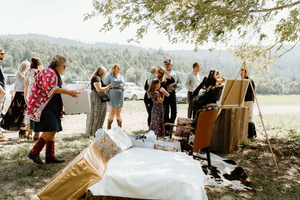 - S’mores + Fire Pit – we had some smaller pews and dad brought in a ton of firewood, so we built a semi-circle seating area with the pews, with a firepit in the middle. This created another seating and relaxing area for guests. It was so nice to have different places and things for people to do and spread out. We also supplied some s’mores materials! Again, guests loved this little touch (especially the kids!).