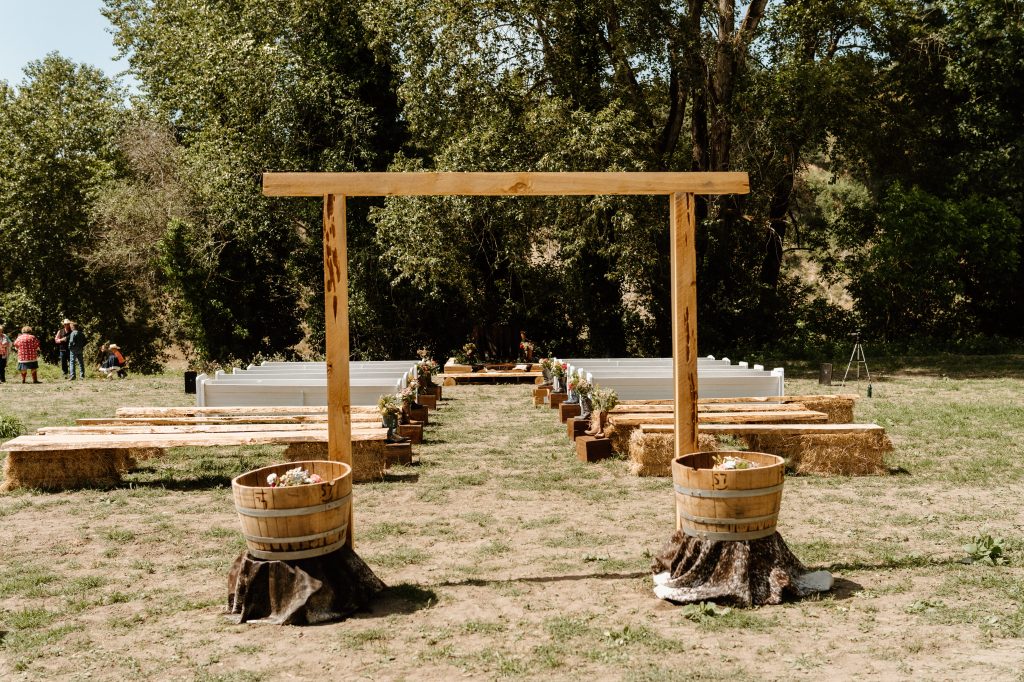 And, why yes, of course my darn church pews made it! They needed some touching up after the long drive, but they did in fact make it into the final vision. For additional seating we set up hay bales – easy and on-trend! I knew a lot of people would opt to stand (that’s cowboys for ya, plus we had the bar open!), so I didn’t worry too much over the additional seating.