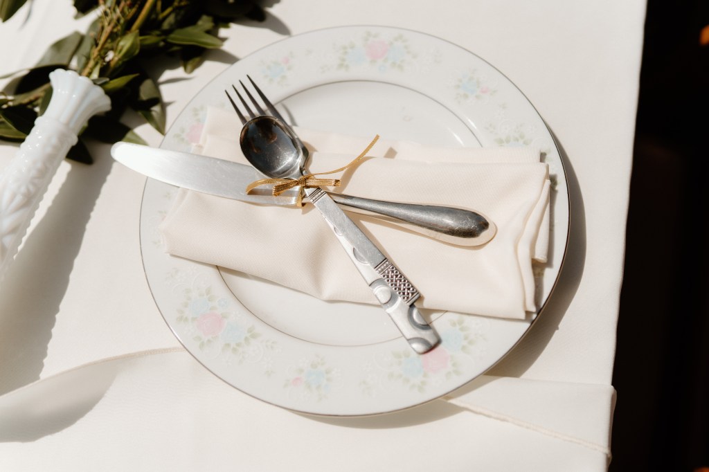 We set the tables up in a different pattern – we mixed rounds and rectangle tables. I wanted the focus to be the dancefloor, so that everyone could see without having to get up and move around. This created a fun design! Each of the place settings was also complete with a real plate – a mix-match of white, white and gold, and white with floral print – a cloth napkin, and a tied set of silverware. My mother-in-law prepped all the silverware, making it easy to set out. My coordinator also helped me arrange boxes of table decorations (candlesticks, bud vases, etc.) for each of the tables, so that the day-of set-up would be quick. My amazing flower vendor also grouped flowers per table to keep colors and textures the same for all. This also made it easy for the set-up team to fill vases.