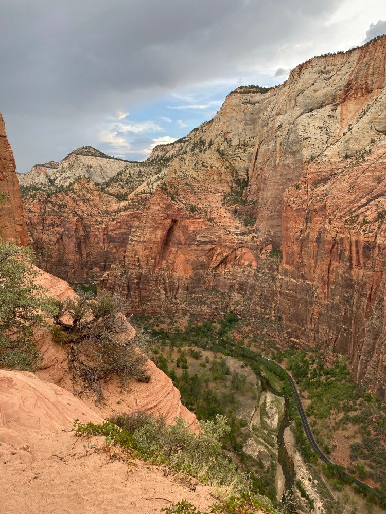 Well, once we got started… we just kept going… After doing a short hike around the lodge, we ended up on the trail to Scout’s Landing (the hard hike I really wanted to do before leaving). Before we knew it, we were halfway up the trail, and figured we might as well keep going! Scout’s Landing is the last stop before using the chains to climb out to Angel’s Landing. I wanted to hike all the way out to Angel’s Landing, but there was a thunder and lighting storm rolling in, and clinging to metal chains on the top of a cliff just doesn’t sound like the smartest idea… plus this last little strip out to Angel’s Landing has huge drop offs on all sides. As I mentioned Jared doesn’t like heights, and he told me no way in hell. It was amazing he pranced around Scout’s Landing at all! It was also starting to turn to evening with the sun dropping, so best to get back before we found ourselves in pure darkness.
